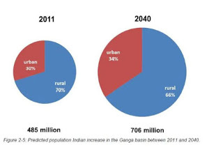 इस परिदृश्य में, हर राज्य की जनसंख्या वृद्धि को देखा जाए, जिसका पूर्वानुमान भारतीय राष्ट्रीय जनसंख्या आयोग 2001-2026 ने 2006 में किया था. अब इसका पूर्वानुमान अब 2080 तक के लिए किया गया है. इसके मुताबिक, गंगा बेसिन में आबादी साल 2040 तक करीबन डेढ़ गुनी हो जाएगी. 2011 की जनगणना के मुताबिक, इस बेसिन की आबादी 45.5 करोड़ थी जो 2040 में बढ़कर 70.6 करोड़ हो जाएगी. बढ़ती आबादी के साथ शहरीकरण भी बढ़ेगा. शहरी आबादी में करीब 70 फीसदी वृद्धि होगी. शहरी आबादी मौजूदा 14.4 करोड़ से बढ़कर 24.3 करोड़ तक हो जाएगी. ग्रामीण आबादी में 35 फीसदी की बढोतरी होगी. यह मौजूदा (2011) के 34.1 करोड़ से पढ़कर 46.3 करोड़ हो जाएगी.
