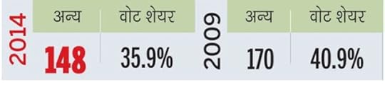 2014 के लोकसभा चुनाव में भारतीय जनता पार्टी (भाजपा) ने कुल 428 सीटों पर चुनाव लड़ा था. उसके 282 उम्मीदवार जीते थे और उन्हें 31.34 वोट प्रतिशत हासिल हुआ था. बहुजन समाज पार्टी 503 सीटों पर चुनाव लड़ी थी और उसका कोई भी उम्मीदवार अपनी सीट जीत नहीं सका था और कुल वैध मतों का उन्हें महज 4.19 प्रतिशत वोट ही हासिल हुआ था. भारतीय कम्युनिस्ट पार्टी ने 67 उम्मीदवार खड़े किए थे और इन्हें सिर्फ एक सीट हासिल हुई थी. वोट प्रतिशत था सिर्फ 0.79.