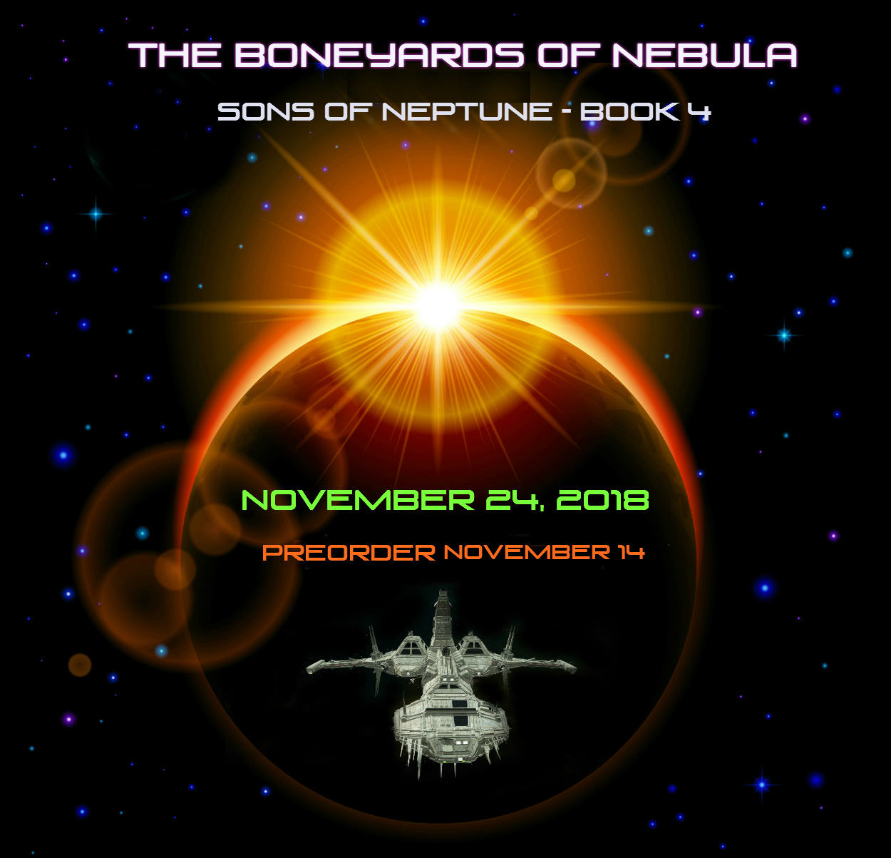 Book 4 in the Sons of Neptune Saga: The Boneyards of Nebula, will be released worldwide on November 24, in paperback and e-book. The Kindle format will be available November 21.Pre-orders can be taken on Amazon after November 14, and the first 2 chapters will be posted here on the RLA website next week. (Delayed due to typesetting on Neptune)