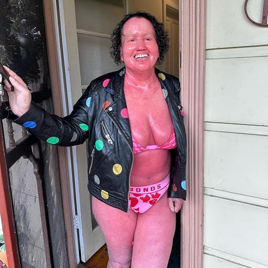 Images: a series of Carly, a woman with Ichthyosis – scaly red skin, wearing underwear and loungewear, being joyous.