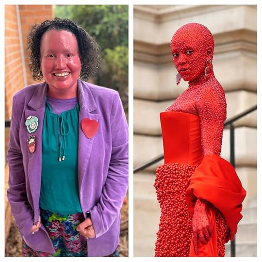 Images: 1. Doja Cat – a woman covered in 30,000 red crystals – over her face and body. She wears a red dress. 2. A collage of two photos side by side. On the left is Carly Findlay, who has red skin due to a skin condition called ichthyosis. On the right is Doja Cat, in the red crystals, red paint and red dress.