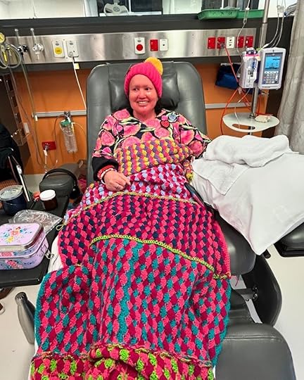 Images: 1. Carly in the treatment ward, surrounded by Danielle, Sandy and Jodee. 2. Sandy and Carly. 3. Danielle and Carly. 4. Natalia and Carly. 5. Carly in the treatment chair – wearing bright clothes, a blue hat by Anita, Hello Kitty brooches, and a colourful crocheted blanket by Friday. A towel covers her cannula.