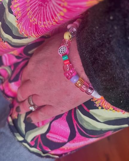 I wore things that people I love made or gave to me, so I had them with me today. A bracelet made by a child, brooches made or given to me by friends, a beanie from a friend, a hand crocheted blanket made by friend.