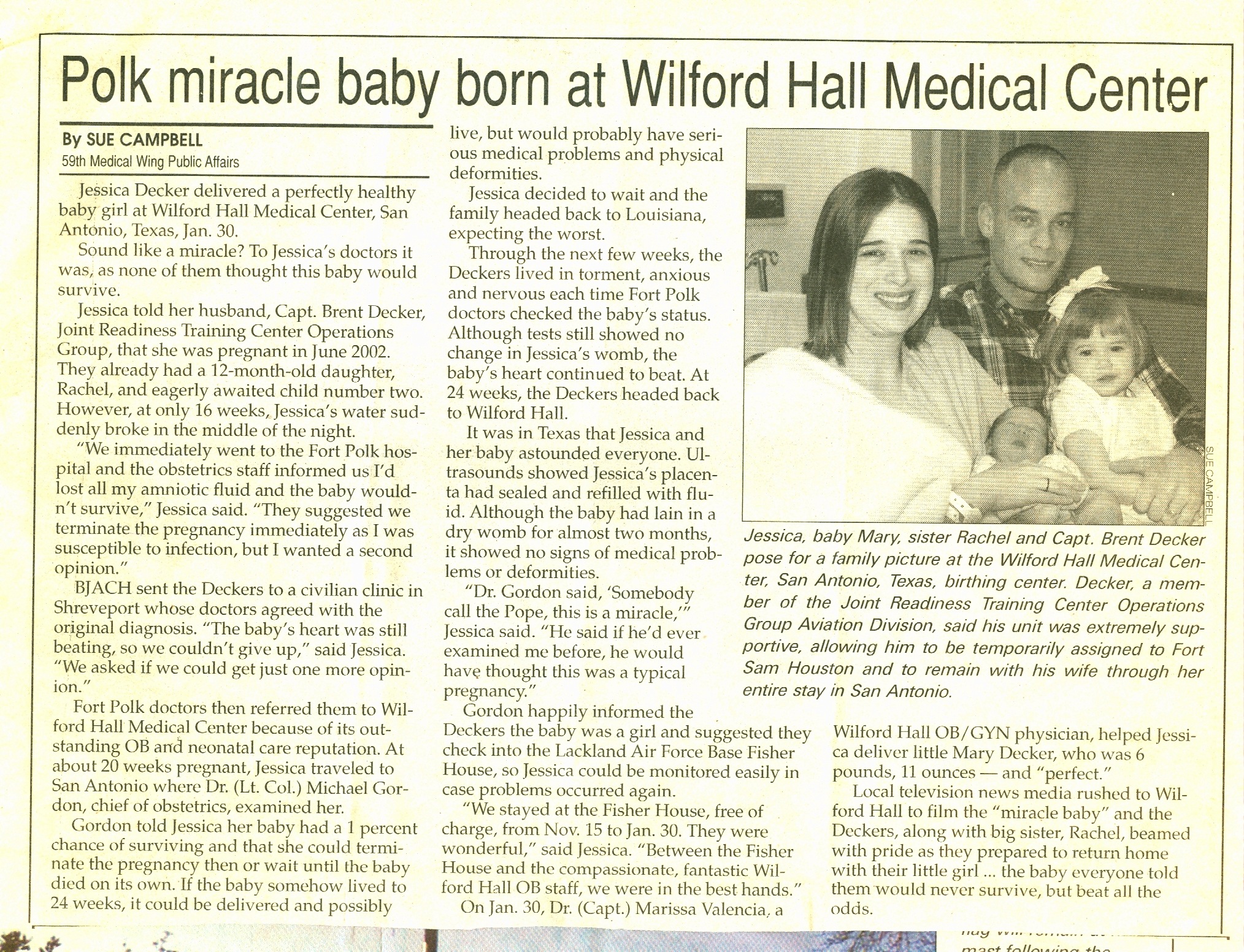 By now, a few of you will have guessed that I’m talking about my sister. Jessica Decker is her name, and Mary Decker, the Miracle Baby, is now an eighteen-year-old honor student at John Paul II Prep with a 4.2 GPA and has her heart set on being a pediatric surgeon.