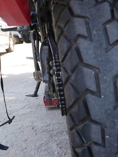 I pointed to where the chain had been eating into the rear tire on the bike, leaving long sweeping gouges in the sidewall of the tire. I stared at it for half an hour as different friendly folk would walk up wondering what I was doing. The chain did not align with the guide from the sprocket, and kept wanting to pull right, into the tire.