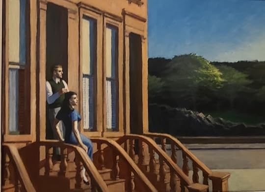 What Hopper helps us realize is the extraordinary in our ordinary. In his work, we find the sliver of light through the window of our small apartment, the summer sunshine and shadows in Central Park, the very first moments of our mornings when we are still between sleeping and waking, the views from our trains and ferries as we rush to our next appointment, that burnt orange hat or sky blue dress that we love to wear, and that moment when we round the corner and spot our friends seated around the bar at our third home where everyone knows our name.