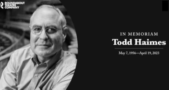 My friend Trevin Cooper, himself a talented theater professional, wrote me this note when he sent me the news that Todd Haimes, President / CEO of New York’s Roundabout Theatre Company, where I got my first job in New York after college, passed away. I put my head down and let two big tears roll down my face.