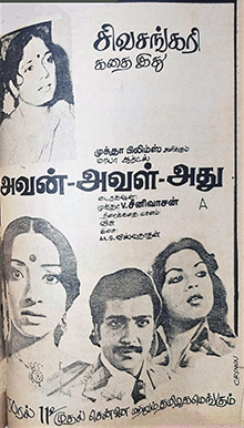 மூலக்கதை எழுத்தாளர் வேண்டாம் சிவசங்கரிஎன்றே குறிப்பிட்டுவிடலாம், எழுத்து வாசிப்பு என்றிருப்பவர்களுக்கு எழுத்தாளர் என்கிற பட்டபெயர் தேவையில்லை, தெருவில் போகிறவர்களோடு அறிமுகம் என்கிறபோதுதான் இது தேவையாகிறது. ரிக்ஷா ஓட்டும் நடிகர் திடீரென ஆங்கிலம்பேசி பாமர இரசிகனை மெய்சிலிர்க்கவைக்கும் அறிமுகம் சிவசங்கரிக்கு தேவையல்ல. ஆங்கிலத்திலோ பிரெஞ்சிலோ கவிஞர் எழுத்தாளர் எனக் கூறி அறிமுகப்படுத்துவதில்லை. சிவசங்கரியின் “ஒரு சிங்கம் முலாகிறது ” என்கிற கதையின் சினிமா வடிவம் “அவன் அவள் அது ” . இயக்கம் முக்தா சீனிவாசன். சராசரி தமிழ்ப்பட வெகுசன இரசனையிலிருந்து விலகி எடுத்திருக்கும் திரைப்படம். சிவக்குமார், இலட்சுமி, ஸ்ரீபிரியா வழ்க்கம்போல , முன்னணி நட்சத்திரங்கள் என்கிற வார்த்தைப் பிரயோகம் தமிழில் இருக்கிறதில்லையா அதைத் தெரிவிப்பதற்காக சில நடிகர்கள். அவர்கள் வந்துபோகிறார்கள், மனோரமா உட்பட. படம் என்னவோ ஸ்ரீப்பிரியா, இலட்சுமி, சிவக்குமார் இவர்களுக்கான படம். திரைப்படத்தில் இவர்கள் பங்களிப்பை இப்படித்தான் வரிசைப் படுத்த வேண்டியுள்ளது. சிவக்குமார் ஒரு கதாநாயகன் வேண்டும் என்பதற்காக சேர்க்கப்பட்டிருக்கிறார்.
