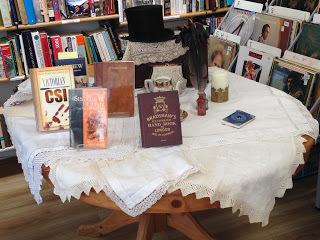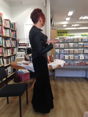 There is nothing more boring than a pile of books on a bare table. Or a bare table. People like to look at interesting stuff while you are speaking. THINK about your genre. I bring a Victorian top hat and hatbox, part of a Victorian tea set, I lay the table with a lace tablecloth, I also have opera gloves, a seed pearl bag and some of my original Victorian books, which I stand up so people can see the covers.I wear a steampunk outfit. I put my books to sell on a separate table away from the talk area.