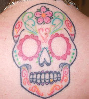 Sugar skull tatI have 5 tattoos in total! My first was a Grim Reaper on my right shoulder when I was 18. Despite wanting another straight away (I'm sure they put some sort of addictive substance in the ink) I didn't have another until my 40th birthday. I got a butterfly and flower design on my left shoulder, but in true Zombie Girl style, the butterfly incorporates a screaming skull on its wing!