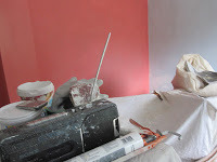 One night, the cats actually brought in a (dead) mouse and laid it at the bottom of the stairs. We decided it was a kind of propitiation to 'the Gods that made such a pother' over their heads. However, all bad things come to an end (except for the Tory party) and by Friday, walls were painted, cats were mollified and BH and I no longer felt we were camping out in our own house. This is the result: I have vanilla walls instead of pale cold blue and a ''bold statement wall'' in geranium! The lovely painting is by Peter Davey, Twitter friend, writer and artist - check him out @PedroYeved. I bought it to go in the newly painted room. Everything else is as it was - just a whole lot brighter.The PINK SOFA is not at all sure about the statement wall and feels there may be colour clash issues, but I have told it that I don't consult with furniture over my colour choices, especially when the aforesaid furniture is a figment of my imagination to begin with. Now all that remains is to sit at my desk in my newly painted room, apply my fingers to the keyboard and produce the next bestseller ....... ah, if only it were that easy.