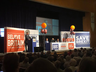 "Yesterday afternoon I attended the "Brexit Roadshow" in Torquay. I had reservations about donating £5 to a cause that I obviously don't support and guess I could have watched the event online, but I wanted to get a feel of the atmosphere first hand. I am glad I did. The event was supposed to be sold out, and to be fair, once I was in the hall I only saw the occasional spare seat. The only person I saw under 40 was the man in his twenties, who took my money on the door.