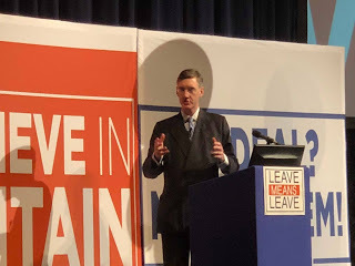 Tim Martin of Wetherspoons, Farage and Rees Mogg were the main speakers, but before I comment on their individual speeches, what was apparent was that no-one was going to give any real facts. All speakers reverted to simple statements with no explanation or detail. We have heard - "take back control, take back our fisheries, make Britain great again etc" all before, but their was no attempt to deal with all the challenges that the reality of Brexit has thrown up. In fact when they did address those issues they chose to trivialise them. Martin actually claiming that the trade across the Irish Border was small and trivial, to be easily sorted. Rees-Mogg joking that a NO Deal would mean a rise in the cost of caviar and that a few lorries might get delayed for a short time at Dover