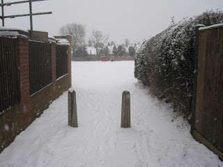Picture me therefore, in the cold and the snow and the ice (just building my part here), trudging the mean streets when whom should I meet but Bill the Builder.* So I stopped and we had a chat about things, and I said I was pretty sure there was an alternative route for the maintenance vehicles to get onto the field, which is what the council is claiming there isn't, which is why they have to build an access road, but I wasn't sure the road I had my eye on was wide enough at the end, where it narrows into an alleyway. And Bill the Builder said 'Carol, I'm sure you could get a 7 ft transit through that alley, and that's what the council ground staff use.'