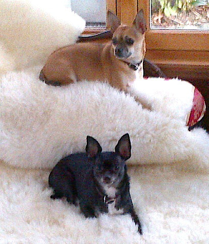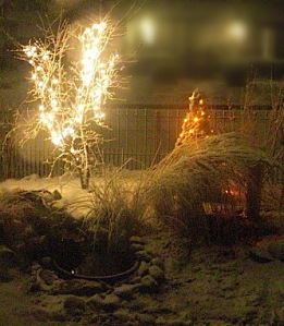 Good News: It snowed! Seriously, it snowed? I took this at about ten last night when it was just beginning to stick. Fortunately Guy and I are pretty well set for the season. Most of the holiday lights are up. We have a puppy shelter erected for Alex and Xander, the tender plants covered, and a new, industrial grade de-icer in the pond for the fish/birds. The fish seem to really appreciate it. You can see my tiny birdbath/fishpond in this picture if you look close.