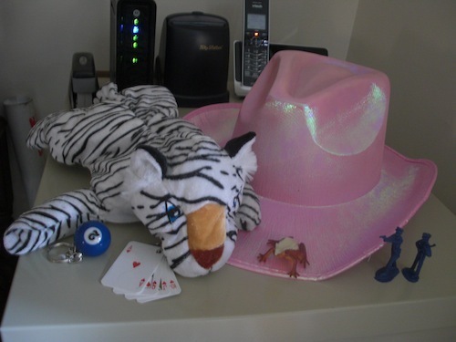 Gaming night at the fair is always my favorite night–a night when I blow more money for stupid stuff than I do all year. But it's not about what you win, though the feeling of winning is important, it's playing with someone, being silly and having fun with someone who is enjoying the time right along with you. I have to say that the people running the games this year were seriously nice (they were happy when you won) and the prizes were cool. (No cheap plastic) I really, really, really wanted a pink cowboy hat, and Guy won it for me. (It sparkles!!) He really wanted a white tiger. I'm not sure who won that one, but we were both trying. And yes. –I– won the cards, pool ball, and the army guys at that stupid roll the coin/pusher game. -grin- I still have the army guys I won last year, guarding