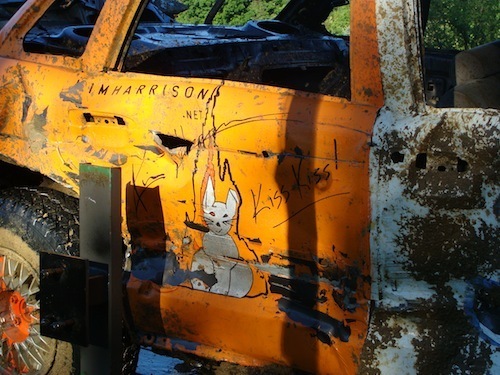 The derby is over, and I've got a couple of shots of the door of car 31, driven by CJ and decorated with a burning bunny. I'm thinking of auctioning it off if they let me, the funds to go to getting next year's car. Do I hear any offers? -grin- (Click for a closeup)