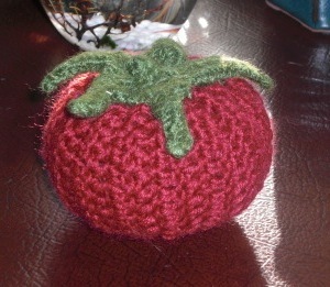 A while back, I told you about crocheting a bunch of certified T-4 Angel free tomatoes to give to my people in New York as a little thank you for everything they do for me every day. There was some interest from you crafters out there, and since I modified the pattern I had for a pumpkin and pepper to make the silly thing, (as in I am not taking this from a book but my own thoughts) I figure that it is okay to share. I knit and crochet both in this, so if you don't know both medias, you will have to adapt . . . somehow . . .