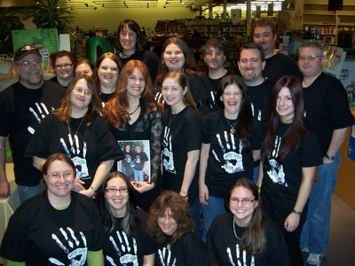 Someone mentioned the tour ts. Now that we have most of the cities, Guy is moving forward on them again, and we should have something for you by mid November. For those of you who don't know, these are the shirts that you might see at a signing, much like a band T. If the store is set up for a Q&A, we always have a "family portrait" of my roadies that goes up onto the website. Sometimes I have as few as four roadies, but sometimes I have a good two dozen. Pictured here is Powells from last year's tour.