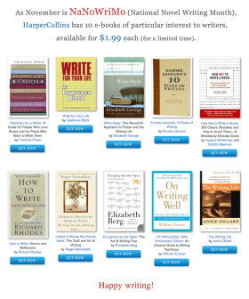 Harper Voyager has an e-book sale going on now in celebration of NaNoWriMo, which is, for those not in the know, National Novel Writing Month, where professional, intermediate, and just-picked-up-the-pen writers rub shoulders in a month-long event to reach 50,000 words in 30 days. This is the second year that I’ve officially joined in, signed up, and tracked my progress at their website, but I’ve known about NaNo for a lot longer. You can find me here at NaNo, and it’s really helped this year as I push through the rough draft of book thirteen.