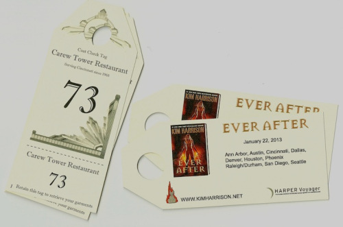 The EVER AFTER tour freebies came in today, and I had to share the instant I saw them! Holy Cow, I like them, and if you’ve read the first chapter available in the mass market of A PERFECT BLOOD, then you’ll recognize the one side as the coat check tag Rachel picked up at the Carew Tower with Quen. :-) I love it when I can bring a piece of the Hollows alive, and I think it turned out especially well this year. I tried to give it a little an art deco feel, which is the style the Carew Tower was designed with. They are okay, but as you can see, I write better than I design. -grin-