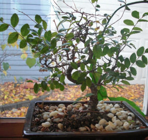 I know I’m risking jinksing it, but I think I might have gotten my little elm tree to hold its leaves through the fall. It’s still kind of early yet to breathe that sigh of relief, but I’ve only lost about half the leaves. The instructions (yes, the tree came with instructions) said if I brought it in soon enough, it might not drop them, and I’m tickled that I might have actually timed it right.