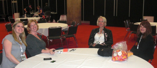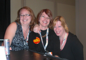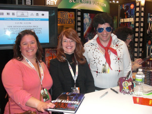 My favorite day was Saturday, when Jocelynn Drake and Richard Kadery came in and we had a panel together: Hocus Pocus. I don’t really have a good picture of the panel in action, but I’ve got a great one of Jocelynn and me with our editor, Diana Gill, that we took afterward. I’ve got my Don’t Panic button on in this one, which seemed to be the theme of the weekend. After the panel, all that was left was a group signing at the Harper booth.