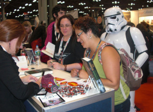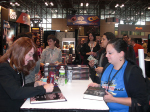 Day two started at the Del Rey booth where I signed the early release copies of BLOOD CRIME, the second Hollows graphic novel. Here I’m with Elvis, yes, he was really there, and he likes the Hollows. SUVUDO works out of the Del Rey booth, and I did an impromptu video interview with them when the line ebbed for a moment. You can still see here. SUVUDO-KIM-NYCC2012.