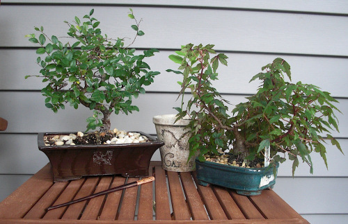 These are three of my favorites that I acquired this spring, trying one last time to keep little trees in little pots alive. I thought I was going to lose the elm, but the begonia took right off. I still might see the elm drop his leaves this fall, but I think he’ll make it, regardless. Way in the back is a bay leaf. I had one of these about 20 years ago and it died from the cold. This particular one almost kicked the bucket for the same reason when it got chilled in shipment, but the last two leaves hug on, and now I’ve got a new batch of growth. Yay! I’m watching all three like a hawk right now because the temps are dipping into the 50s at night, so nightly relocations into my office are required.
