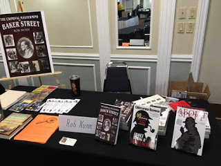 I had a vendor's table at the convention to sell copies of The Criminal Mastermind of Baker Street, About Sixty and About Being a Sherlockian, so my morning started pretty early. Before setting up the table, I headed down for breakfast, and although I sat down at a table by myself, I was soon joined by Joe and Peter Eckrich, Fran Martin, Ray Betzner and Monica Schmidt. I was quickly learning that there aren't strangers when you're at a Sherlockian event.