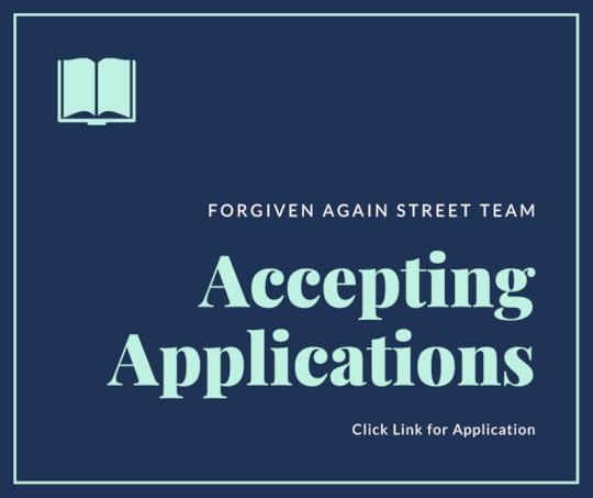 I am now accepting applications to be part of my review/street/launch team for the release of my novel, Forgiven Again, a christian romantic suspense. Forgiven Again is book 2 in my Shadows Over Whitman series.