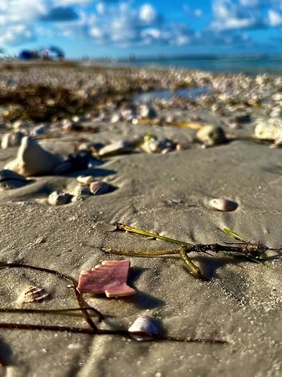 Acting quickly, I took a crunchy step forward and plucked the tiny shell piece from the beach–leaving behind a jagged outline and shallow impression.