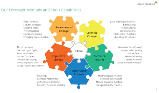 witness and celebrate individual and collective contributionscreate a textured understanding of the shared present realitypay forward insights in creative ways to amplify their future impact with diverse groups of stakeholdersJigsaw Foresight, cofounded with Wendy Schultz, traces its origins back to 2006, when Victoria first met Wendy while conducting a retrospective of Defra’s investment in horizon scanning and foresight research. The purpose of Jigsaw is: