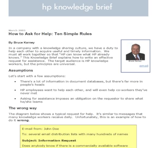 An example of a knowledge brief was “How to Ask for Help: 10 Simple Rules” by my HP colleague, Bruce Karney. He documented a method to increase the likelihood of receiving useful answers when asking for help. Bruce wrote this because he had frequently received requests for help with insufficient information about the needs, thus frustrating the people trying to help. He took the time to write a white paper that explained in detail how to improve the odds of receiving assistance in response to requests for help. This is good example of how documenting proven approaches allows other people to read about and apply that knowledge productively.