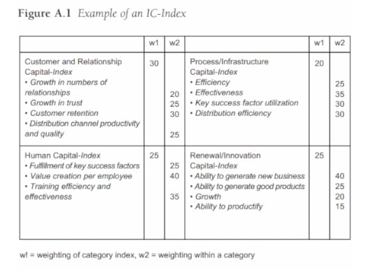 They therefore break down the overall intellectual capital into subsections, using the categories of human, customers and relationships, processes and infrastructure, and renewal and innovation. For each category a small set of indicators is carefully chosen. These indicators are each weighted to form a category index, and the category indices are themselves weighted to form an overall IC-Index.