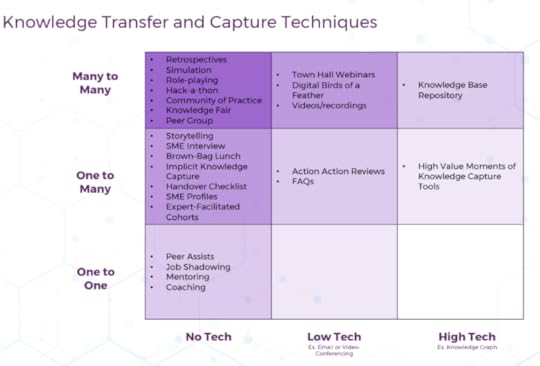 Governance: The roles, responsibilities, processes, and procedures necessary to maintain KM-related processes over time.Taxonomy & Information Architecture: Taxonomies are controlled vocabularies used to describe explicit concepts. Information architecture standardizes and simplifies where and how content is stored and tagged.Content/Document Management: The strategies, methods, and tools used to capture, manage, store, and share content and documents in the most optimal way possible.Search: The best search experiences connect people to information, information to information, and people to people, while addressing foundational concepts in search.Collaboration: The ability for stakeholders and users to work together in terms of content creation and content management.Change Management: Places people at the center of the process to make change real and ensure it sticks.Automation: The ability to reduce the manual work associated with tasks, processes, and procedures through the creation and application of technology.He showed the following chart differentiating capture techniques from no tech to high-tech (X axis) and from one-to-one to many-to-many (Y axis):