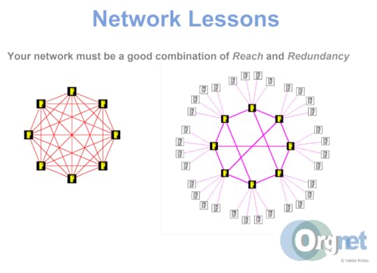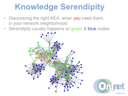 Valdis suggested that those who are one, two, or three steps away from you comprise your network neighborhood, and that those who are four, five, or six steps away don’t matter. Serendipity usually happens with those in the green and blue nodes as pictured here: