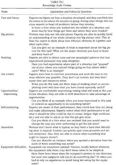 Table 23.1 presents the set of Knowledge Audit probes in the current version. These are listed in the column on the left. Table 23.1 also shows the types of follow-up questions that would be used to obtain more information. At the conclusion of the interview, this format becomes a knowledge representation. By conducting several interviews, it is possible to combine the data into a larger scale table to present what has been learned.
