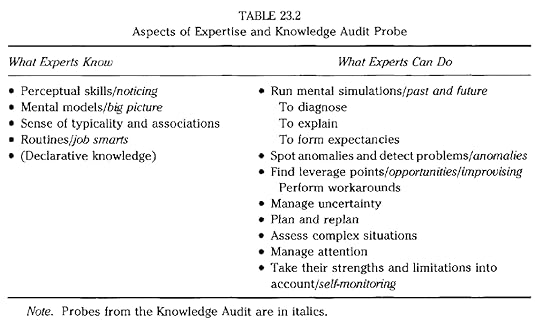 Experts also have a lot of declarative knowledge, but this is put in parentheses in Table 23.2 because Cognitive Task Analysis does not need to be used to find out about declarative knowledge.