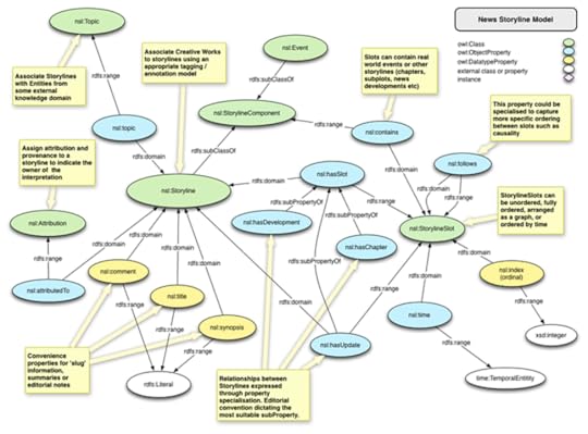 Know your audience: It’s vital to understand the way that your audience interacts with your website and your index. There are many ways of doing this; three that can be particularly useful are search log analysis, persona development, and user testing. Search logs have been invaluable throughout the lifecycle of the A-Z to highlight the areas of interest to users. They also shed light on the language used by people trying to find things on the site. Even though the A-Z is a browse tool and search is a search tool, don’t ignore the common goals of their respective users: finding stuff easily.Show your numbers: Don’t make your users guess: even if there’s only one non-alphabetic entry, show that it exists. Many indexes fudge the challenge of entries that begin with numerals by shoving them, for example, in under ”A” or “Z.” Chances are, the entries will only ever be found by serendipitous browsing or lucky guessing. Whatever it is labeled, make the numbers section or page prominent by placing it in front of the letter “A.” This is a convention in computer books that index technical concepts.Acknowledge articles: The question of how to deal with entries that start with “the,” “a,” or “an” became important for bbc.co.uk because of the sheer volume of program titles that needed to be added to the index. Eventually we decided to double-post entries under both the first letter of the article word and whatever letter the next word started with, hence entries for both “The Apprentice” and “Apprentice, The”. As with the previous tip, why make users stop to think about how the indexer might choose to see the content? The beauty of an A-Z over a directory or a sitemap is that different mental models can be supported and the same thing can appear in more than one place. This gives it an advantage over, say, the Grand Vizier’s camels.Include synonyms: Synonyms, in the form of “See: XX” references, appear throughout the bbc.co.uk index. As in the traditional thesaurus, they are used to show equivalence between a word or phrase and its preferred term. Synonyms in an A-Z add richness to the list of entries–and can often allow you to speak your users’ language without losing the ability to call entries by their correct names. Equally, synonyms play a role in educating users as to what those correct names are. For bbc.co.uk, many synonyms are used in the A-Z to provide alternative access paths to branded content. For example, the radio station Five Live is always written with a word rather than a number, but a user scrolling through the numbers page will see a pointer to it.Properly index proper names: People should be indexed by surname rather than first name, as per book indexing convention. There are of course some exceptions; for example, the names of monarchs (“Charles I”), certain celebrities (“Mel B”), or people from cultures where the surname appears before the first name (“Mao Tse-Tung”).Consider your cross-references: In general, the bbc.co.uk A-Z avoids excessive cross-referencing, which could make already long pages less usable and less attractive to casual browsers. However, bringing closely related concepts together can add value to the index and promote content in different places. Cross-references are shown as “See Also:” pointers in entries, such as a country name linked to content about the languages that are spoken there.Use qualifiers and extra information: Besides synonyms and cross-references, there are other ways to make your index more user-friendly. Qualifiers are extra bits of information in parentheses, attached to index entries, often for clarifying concepts. For example, the bbc.co.uk A-Z qualifies dance as “(Performing Art)” in order to differentiate it from dance music, which is also covered in depth on the site.Take pride in the index: Dealing with everything mentioned in the other seven tips will give your index a fighting chance of being successful. None of it will matter, however, if users cannot find it. Make the A-Z index available from all parts of your site if you can, preferably linking to it in a consistent, prominent place on every page. This might be in a toolbar or as part of the navigation. Whatever you do, don’t follow the example of some sites that put the link to the A-Z at the bottom of the page, in tiny size 1 font, with other links that very few people (apart from lawyers) ever see, let alone click on.Storyline OntologyThe News Storyline Ontology is a generic model for describing and organizing the stories news organizations tell. The ontology is intended to be flexible to support any given news or media publisher’s approach to handling news stories. At the heart of the ontology, is the concept of Storyline. As a nuance of the English language the word ‘story’ has multiple meanings. In news organizations, a story can be an individual piece of content, such as an article or news report. It can also be the editorial view on events occurring in the world.