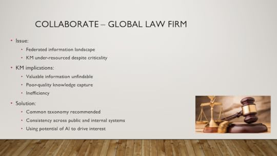 The global KM community has been a huge influence from organizations like KMI and APQC to associations and individuals. Naturally, I have to give props to the sages of KM as I like referring to them: Doug Weidner, Stan Garfield, and Cindy Hubert, among others. I’ve learned so much by simply watching these folks share their wisdom in community forums, online discussions, and conferences. It’s amazing to see leaders like Stan and Doug jump in with guidance and insight — it’s a real-time masterclass.
