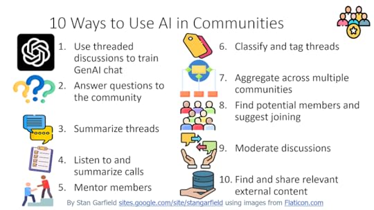 Train: Use threaded discussion history to train GenAI chat.Question Answering: AI can respond to queries posted in threaded discussions by searching for previous answers and looking outside the community.Thread Summaries: AI can summarize threads to extract the key points from lengthy discussions.Call Summaries: AI can listen to and summarize community calls for the benefit of those who attended and those who were unable to do so.Mentoring: AI can act as a mentor to community members by advising them based on past discussions, calls, and submitted content.Thread Tagging: AI can tag threads in a consistent manner and add tags not supplied by those posting.Aggregation: AI can monitor activity in multiple communities and aggregate the important content so that it is not missed.Recruitment: AI can find potential members and suggest that they join relevant communities.Moderation: AI can monitor discussions looking for inappropriate language, inflammatory exchanges, and confidential information that should not be discussed, and act promptly to provide the desired remedy.Discovery: AI can find and share relevant external content that members might not otherwise see.