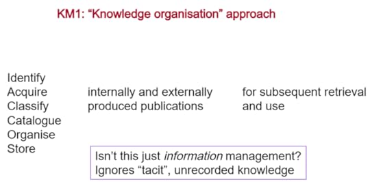 Turning implicit knowledge into explicit knowledgeBringing ideas to lifeCapturing know-howIdentifying needs and resourcesOffering simple solutionsIn the end, KM is about recording experience as it unfolds. But you have to do it methodically: