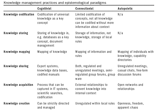 Cognitivist — Cognitivists consider the identification, collection and central dissemination of information as the main knowledge development activity. Organizations are considered as open organizations that develop increasingly accurate pictures of their pre-defined worlds through the assimilation of new information. Knowledge is developed according to universal rule, hence the context of the incoming information is important.Connectionist — There are many similarities here to the cognitivist viewpoint but a difference being that there are no universal rules. As rules are team-based and vary locally, organizations are seen as groups of self-organized networks dependent on communication. The connectionists believe that knowledge resides in the connections and hence focus on the self-organized dispersed information flow.Autopoietic — Here the context of information inputs is unimportant; it is seen as data only. The organization is a system that is simultaneously open (to data) and closed (to information and knowledge). Information and knowledge cannot be transmitted easily since they require internal interpretation within the system according to the individual’s rules. Thus autopoietics develop individual knowledge, and respect that process in others.
