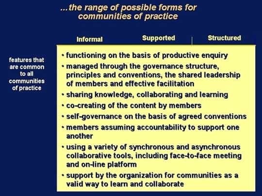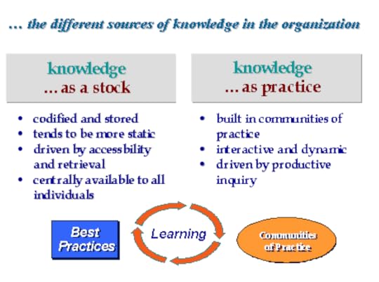 For instance, we might build a sales-management community by bringing together 20 or so of our good sales agents and letting them interact with those mountains of information through a shared database. They could exchange their respective learning and understanding, interact as a community around the information, build up tacit knowledge, and use it to apply that store of explicit knowledge and come up with new ideas or approaches.