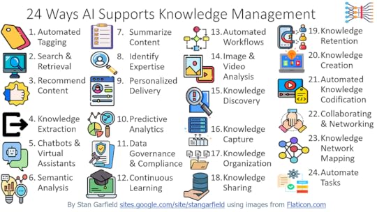 Infographic Number 57 in Knowledge Nuggets: 100 KM InfographicsAutomated Content Categorization and Tagging: AI can automatically categorize and tag documents, articles, and other content based on their content, making it easier to organize and retrieve relevant information.Search and Retrieval: Advanced search algorithms powered by AI can enable more accurate and efficient information retrieval. Natural language processing (NLP) techniques allow users to search using natural language queries, making it easier to find specific information within a knowledge repository.Content Recommendation: AI can analyze user preferences and past interactions to recommend relevant articles, documents, or resources, thus improving knowledge discovery and dissemination.Knowledge Extraction: AI can analyze unstructured data sources like text documents, emails, and even audio recordings to extract valuable insights and knowledge. This can be particularly useful in identifying trends, sentiment analysis, and distilling information from large datasets.Chatbots and Virtual Assistants: AI-powered chatbots or virtual assistants can provide instant responses to common queries, guide users through knowledge repositories, and offer real-time support for information retrieval.Semantic Analysis: AI can analyze the semantic meaning of content, enabling it to understand relationships between concepts and providing more accurate context-based search results.Content Summary: AI can automatically generate concise summaries of lengthy documents, helping users quickly grasp the key points without reading the entire content.Collaboration and Expertise Location: AI tools can identify subject matter experts within an organization based on their contributions, interactions, and expertise. This helps facilitate collaboration and knowledge sharing.Content Personalization: AI can tailor content recommendations based on individual user roles, preferences, and history, ensuring that users receive information most relevant to their needs.Predictive Analytics: AI can analyze historical data to predict future trends, behaviors, and challenges. This can guide decision-making and knowledge management strategies.Data Governance and Compliance: AI can help ensure that knowledge management practices adhere to data governance and compliance standards by automatically identifying sensitive or confidential information.Continuous Learning and Improvement: AI can learn from user interactions and feedback, continuously improving its ability to provide relevant and accurate knowledge management support.Automated Workflows: AI can streamline processes by automating routine tasks such as content updates, version control, and approvals in knowledge management systems.Image and Video Analysis: AI techniques can be applied to images and videos, allowing for better organization and retrieval of multimedia knowledge assets.Knowledge Discovery: AI can analyze large volumes of data to identify patterns, trends, and insights that would be difficult for humans to uncover. This allows organizations to make better decisions and identify new opportunities.Knowledge Capture: AI can listen to conversations, read documents, and analyze interactions to automatically extract important information. This helps capture tribal knowledge that often walks out the door when employees leave.Knowledge Organization: AI can categorize and tag information, building knowledge taxonomies and ontologies. This makes it easier for people to find relevant information when needed.Knowledge Sharing: Chatbots and virtual assistants powered by AI can provide quick access to information for employees. Additionally, recommendation engines can suggest relevant content to individuals.Knowledge Retention: By continually interacting with humans, AI systems can learn and retain organizational knowledge over time. This institutional memory preserves knowledge even as employees come and go.Knowledge Creation: AI can combine disparate pieces of information to generate new insights and ideas. This catalyzes innovation and helps create new knowledge.Knowledge Codification: AI can be used to automate the process of codifying knowledge from a variety of sources, such as documents, databases, repositories, and other forms of captured information.Collaborating and Networking: AI can be used to facilitate collaboration and networking among knowledge workers. This can be done by using chatbots and virtual assistants to answer questions, by using social media to connect with experts, and by using machine learning to identify and recommend potential collaborators.Knowledge Network Mapping: AI can create a real-time knowledge network. An organization’s entire knowledge network can be mapped out in real time. Employees can quickly identify subject matter experts. The platform learns with every interaction, and the knowledge network becomes more robust.Task Automation: AI can automate data entry, document processing, customer support, reporting, scheduling, sending reminders, transcribing meeting notes, and other repetitive tasks.12 KM Processes AI Can Help StreamlineAI can be used to enhance and support many knowledge management processes. Following are details on how this can be done for a dozen of them.