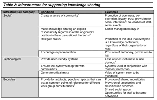 Develop “reflective practitioners.”Create incentives for encouraging learning.Stress learning at all levels — individual learning, team/group learning and inter-project learning; develop a lessons learned process and generic templates for target audiences).Knowledge Sharing Tenets for SuccessEnhance reward and recognition system to include learning and knowledge sharing competencies.Acquaint people with knowledge sharing and its benefits.Share the message that with creativity comes failure and we all benefit from talking about our successes and our failures.Integrate knowledge sharing into everyone’s job.Educate people about what types of knowledge are valuable and how they can be used.Make sure the technology works for people, not vice versa.[image error]November 1, 2024