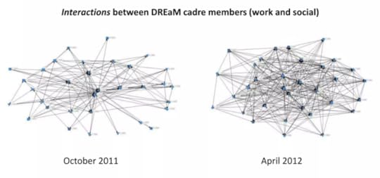 The above diagram shows the project network soon after the missed deadline. Notice the clustering around formal departments — blues interacting with blues, greens interacting with greens. The initial communication in this project was very siloed! Several of the hubs in this network were under-performing and came across as bottlenecks. Project managers saw the need for more direct integration between the departments. One of the solutions was very simple, yet effective — co-location of more project team members — a surprising solution in the age of the Internet! Another solution was minor change in a policy and a business process. These small interventions improved the information flow, and reduced the communication load on the hubs, whose performance improved later in the project.