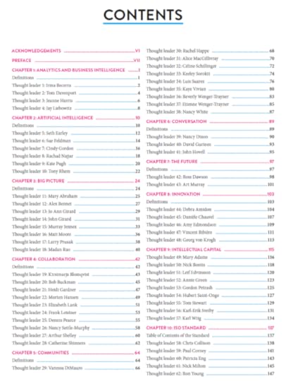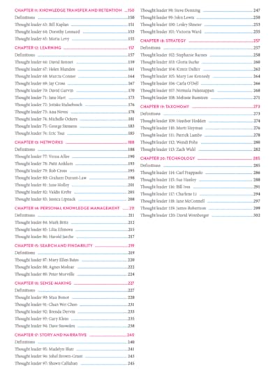 PrefaceThis book is about leading thinkers in the field of knowledge management, grouped into 20 categories. There is a description with definitions for each category and profiles for 120 thought leaders, including quotes from each, books and other important content, and key insights, frameworks, models, and principles.