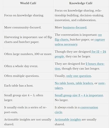 Take Responsibility: We can choose to take responsibility for the changes we wish to see in the world.Embrace Complexity: We need to understand complexity and its implications.Practice Leadership: We all have influence and the potential to lead and make a difference. Leadership is a choice.Leverage the Power of Conversation: We need to improve our conversational skills.Nurture Community: We need to care more about each other.The differences between the Knowledge Café and the World Café